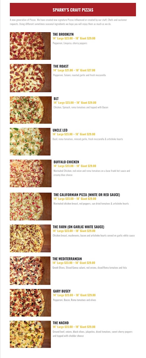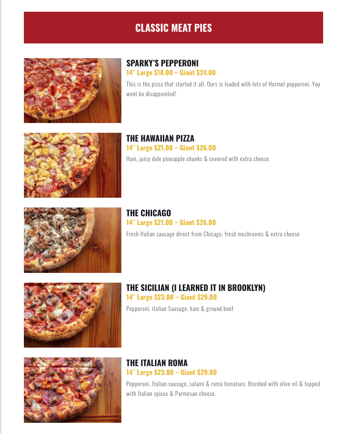 At Sparky's, you’ll immediately notice the commitment to quality and taste. The menu offers a variety of tantalizing options that beckon to your appetite. If you're in the mood for classic flavors, indulge in their renowned Sparky’s Pepperoni Pizza, where succulent Hormel pepperoni is laid lavishly atop gooey, melted cheese—it's no surprise that this is their signature dish! For those craving a twist on tradition, the Hawaiian Pizza brings a delightful combination of sweet Dole pineapples paired with savory ham, enveloped in molten cheese that will leave you wanting more.